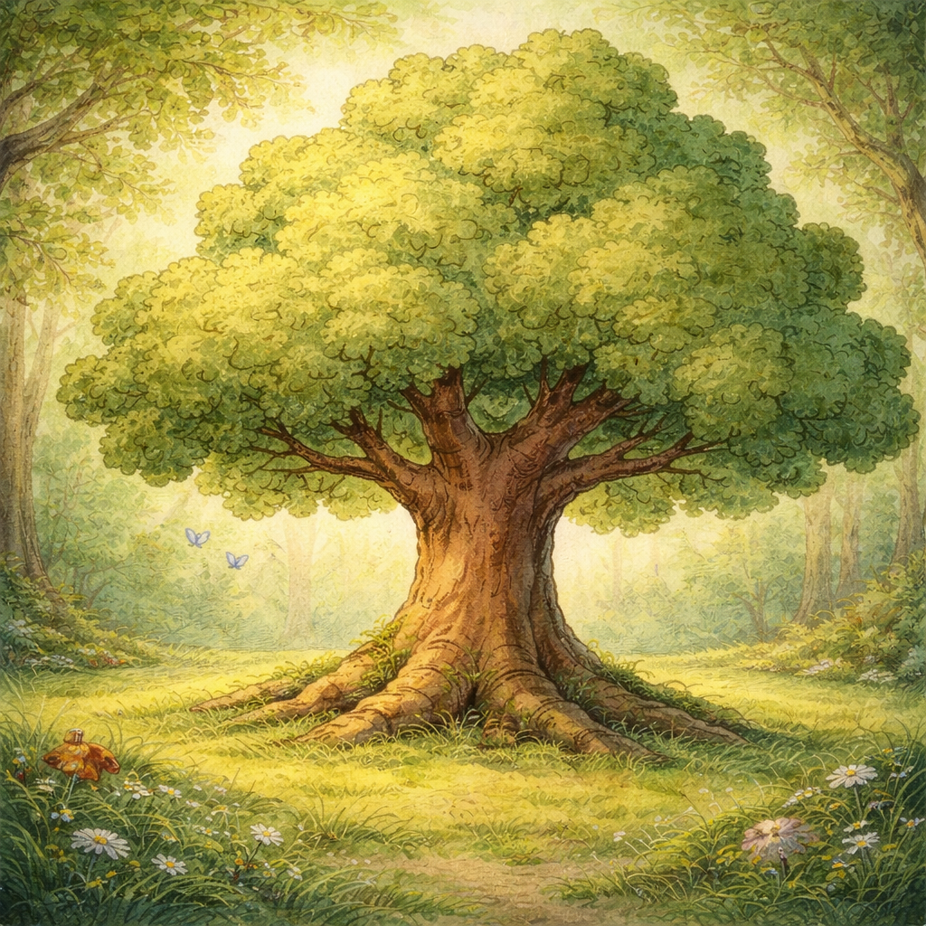 Midt i skoven åbner træerne sig i en lysning. Her står et stort, gammelt egetræ. Det er skovens første træ. Alle de andre er kommet til siden, men egetræet har stået her fra begyndelsen. Det er skovens hjerte – og vennernes foretrukne samlingssted.